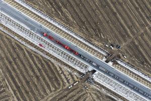 (251125) — QING’AN, 25 noviembre, 2025 (Xinhua) — Vista aérea tomada con un dron el 25 de noviembre de 2025 de un sitio de construcción del ferrocarril de alta velocidad Harbin-Yichun, en el distrito de Qing’an, en la provincia de Heilongjiang, en el noreste de China. El tendido de vías del ferrocarril de alta velocidad Harbin-Yichun finalizó el martes. El ferrocarril de alta velocidad Harbin-Yichun es el ferrocarril de alta velocidad más septentrional de China que se encuentra en construcción. (Xinhua/Wang Song) (jg) (ra) (vf)