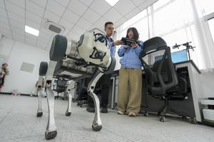 (260416) -- HARBIN, 16 abril, 2026 (Xinhua) -- Imagen del 15 de abril de 2026 de técnicos probando un perro robot utilizado para el control de calidad en la logística ferroviaria en una base experimental de China Railway Harbin Group of Technology Corp., en Harbin, en la provincia de Heilongjiang, en el noreste de China. Las autoridades ferroviarias de Harbin han desplegado diversos tipos de equipos tecnológicos inteligentes y no tripulados para satisfacer las necesidades de transporte de mercancías, garantizando la entrega eficiente de insumos agrícolas de primavera y cereales. (Xinhua/Wang Song) (da) (ra) (vf)