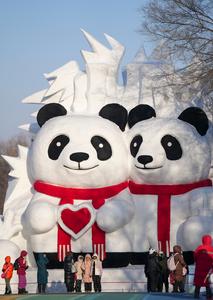 (260109) -- HARBIN, 9 enero, 2026 (Xinhua) -- Imagen del 7 de enero de 2026 de turistas tomándose fotografías con esculturas de nieve con forma de panda gigante mientras visitan la 38 Exposición Internacional de Arte de Esculturas de Nieve de la Isla del Sol, en Harbin, en la provincia de Heilongjiang, en el noreste de China. La exposición de arte de esculturas de nieve en curso, con una superficie de exhibición de 1,5 millones de metros cuadrados, atrae a los visitantes con sus impresionantes paisajes de hielo y nieve. (Xinhua/Wang Jianwei) (oa) (ra) (vf)