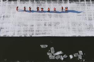(251209) — HARBIN, 9 diciembre, 2025 (Xinhua) — Vista aérea tomada con un dron de trabajadores recolectando hielo en la sección de Harbin del río Songhua, en Harbin, en la provincia de Heilongjiang, en el noreste de China, el 9 de diciembre de 2025. La recolección de hielo está en marcha en los tramos congelados del río Songhua, en la «ciudad de hielo» de China, Harbin. Los trozos de hielo recolectados aquí serán tallados para convertirlos en toboganes, castillos y otros monumentos emblemáticos de la capital de la provincia de Heilongjiang. (Xinhua/Zhang Tao) (jg) (ra) (vf)