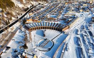 (260115) -- HAILIN, 15 enero, 2026 (Xinhua) -- Vista aérea tomada con un dron del paisaje invernal del poblado de Hengdaohezi, en la ciudad de Hailin, en la provincia de Heilongjiang, en el noreste de China, el 15 de enero de 2025. Conocido como "un poblado tirado por trenes", Hengdaohezi se estableció originalmente a finales del siglo XIX cuando los rusos construyeron allí talleres de mantenimiento de trenes y otras instalaciones tras la construcción del Ferrocarril Oriental Chino. Gracias a sus edificios históricos bien conservados, este exótico poblado se ha convertido en un popular destino turístico. (Xinhua/Yang Zhe) (da) (ra) (vf)