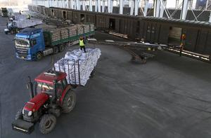 (260318) -- HARBIN, 18 marzo, 2026 (Xinhua) -- Imagen tomada con un dron el 17 de marzo de 2026 de un trabajador descargando fertilizantes en el departamento comercial de Suihua del Centro Logístico Ferroviario de Harbin, en Suihua, en la provincia de Heilongjiang, en el noreste de China. La provincia de Heilongjiang, conocida como el "granero" de China, ha entrado recientemente en la temporada alta de envío de materiales agrícolas para la próxima siembra de primavera. (Xinhua/Wang Song) (jg) (da) (ce)