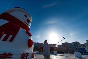 (260117) — HARBIN, 17 enero, 2026 (Xinhua) — Imagen del 16 de enero de 2026 de una turista posando para una fotografía con un muñeco de nieve gigante, en la ciudad de Fujin, en la provincia de Heilongjiang, en el noreste de China. Con la llegada de la temporada de hielo y nieve, diversas instalaciones públicas de la provincia de Heilongjiang han creado paisajes distintivos con temática de muñecos de nieve para atraer a los habitantes y turistas. (Xinhua/Qu Yubao) (oa) (da)