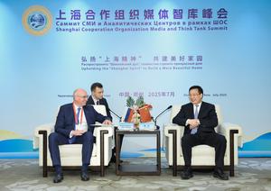(250724) — ZHENGZHOU, 24 julio, 2025 (Xinhua) — Fu Hua, presidente de la Agencia de Noticias Xinhua, se reúne con Andrey Kondrashov, director general de la agencia de noticias TASS de Rusia, en Zhengzhou, en la provincia de Henan, en el centro de China, el 24 de julio de 2025. Fu sostuvo el jueves reuniones por separado con líderes de medios de comunicación que asisten a la Cumbre de Medios de Comunicación y Think Tanks de la Organización de Cooperación de Shanghai (OCS) en Zhengzhou. (Xinhua/Huang Jingwen) (jg) (ah) (ce)