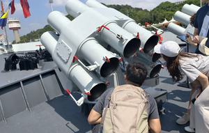 (250705) -- HONG KONG, 5 julio, 2025 (Xinhua) -- Personas visitan la fragata de misiles Yuncheng, en Hong Kong, en el sur de China, el 5 de julio de 2025. Una flota de la Armada del Ejército Popular de Liberación (EPL) de China encabezada por el portaaviones Shandong, llegó a la Región Administrativa Especial de Hong Kong la mañana del jueves, iniciando una visita de cinco días. El portaaviones y el destructor de misiles Yan'an fueron anclados cerca del extremo oeste del Puerto Victoria, mientras que el destructor de misiles Zhanjiang y la fragata de misiles Yuncheng atracaron en la base naval de la guarnición de Hong Kong del EPL en la Isla Stonecutters. Esta es la primera visita del Shandong a Hong Kong. Del viernes al domingo, el Shandong, el Zhanjiang y la Yuncheng ofrecerán visitas abiertas, conferencias, demostraciones de ejercicios y otras actividades de intercambio. (Xinhua/Huang Qiantian) (jg) (da)