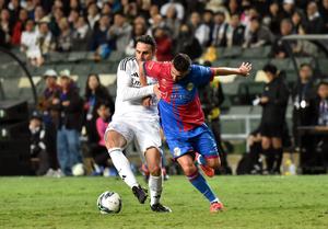(241220) — HONG KONG, 20 diciembre, 2024 (Xinhua) — Javier Saviola (d), de Héroes del Barcelona, disputa el balón con Antonio Nuñez Tena, de Leyendas del Real Madrid, durante un partido de exhibición entre Leyendas del Real Madrid y Héroes del Barcelona, en Hong Kong, en el sur de China, el 20 de diciembre de 2024. (Xinhua/Lo Ping Fai) (oa) (da) (ce)