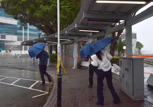 (250924) -- HONG KONG, 24 septiembre, 2025 (Xinhua) -- Turistas caminan en contra del fuerte viento en la Plaza de la Bauhinia Dorada, en Hong Kong, en el sur de China, el 24 de septiembre de 2025. El Observatorio de Hong Kong emitió la señal de huracán número 10, la advertencia de máximo nivel, a las 2:40 a.m. hora local del miércoles mientras el supertifón Ragasa pasaba rápidamente. Esta fue la segunda vez que se activó la alerta máxima este año después del paso del tifón Wipha el 10 de julio. Hong Kong no ha repetido la señal número 10 en un año desde 1964. (Xinhua/Chen Duo) (ah) (vf)
