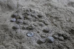 (250930) -- WUHAN, 30 septiembre, 2025 (Xinhua) -- Imagen de diciembre de 2023 de un conjunto de huevos de dinosaurio fosilizados en el sitio de la montaña Qinglong, en la ciudad de Shiyan, en la provincia de Hubei, en el centro de China. Científicos chinos han determinado que un huevo de dinosaurio, desenterrado en las montañas a lo largo de un afluente del río Yangtse en el centro de China, tiene alrededor de 86 millones de años utilizando un método de datación poco convencional nunca antes aplicado a cascarones de huevo fosilizados. (Xinhua/Instituto de Geociencias de Hubei en China) (jg) (ra) (ce)