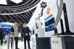 (251122) — WUHAN, 22 noviembre, 2025 (Xinhua) — Imagen del 21 de noviembre de 2025 visitantes observando una máquina con un sistema de escaneo 3D automatizado durante la Conferencia de Internet Industrial 5G + China 2025, en Wuhan, en la provincia de Hubei, en el centro de China. La conferencia comenzó aquí el viernes y se prolongará hasta el domingo. (Xinhua/Xiao Yijiu) (oa) (da)