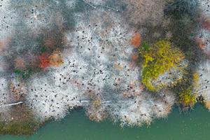 (251216) -- WUHAN, 16 diciembre, 2025 (Xinhua) -- Vista aérea tomada con un dron el 16 de diciembre de 2025 de aves descansando en los árboles en el área escénica del Lago Donghu, en Wuhan, en la provincia de Hubei, en el centro de China. (Xinhua/Xiao Yijiu) (oa) (ah) (vf)