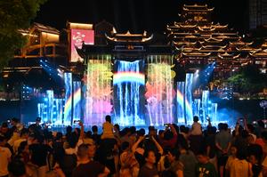 (250810) -- ENSHI, 10 agosto, 2025 (Xinhua) -- Imagen del 9 de agosto de 2025 de personas visitando un mercado acuático cerca del río Gongshui, en el distrito de Xuan'en, en la prefectura autónoma tujia y miao de Enshi, en la provincia de Hubei, en el centro de China. El mercado acuático abrió sus puertas al público el sábado por la tarde. (Xinhua/Song Wen) (oa) (da)