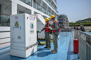 (250410) -- YICHANG, 10 abril, 2025 (Xinhua) -- Trabajadores de la State Grid Yichang Power Supply Company inspeccionan instalaciones de energía eléctrica en tierra, en el puerto de Zigui, en la ciudad de Yichang, en la provincia de Hubei, en el centro de China, el 10 de abril de 2025. En años recientes, Yichang en la provincia de Hubei, en el centro de China, ha estado promoviendo el uso de energía eléctrica de tierra que permite que los barcos se conecten a la red eléctrica local mientras están en el puerto, en lugar de encender los motores diésel para generar electricidad. Esto puede reducir significativamente las emisiones de los buques, proteger el entorno ecológico del río Yangtse y apoyar el transporte marítimo ecológico. (Xinhua/Du Zixuan) (rtg) (ra) (vf)