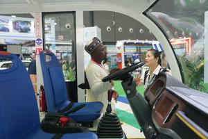 (250612) — CHANGSHA, 12 junio, 2025 (Xinhua) — Una expositora presenta un vehículo turístico a un visitante en el Centro Internacional de Convenciones y Exposiciones de Changsha, en Changsha, en la provincia de Hunan, en el centro de China, el 12 de junio de 2025. La cuarta Exposición Económica y Comercial China-Africa abrió sus puertas el jueves en la ciudad central china de Changsha. Cerca de 4.700 empresas chinas y africanas y más de 30.000 participantes asistirán al evento de cuatro días de duración con el tema «China y Africa: Juntos hacia la modernización». (Xinhua/Xue Yuge) (rtg) (ra) (vf)