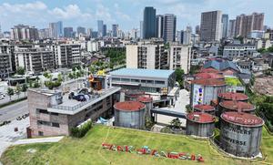 (250713) -- CHANGSHA, 13 julio, 2025 (Xinhua) -- Vista aérea tomada con un dron de un depósito de petróleo obsoleto, en Changsha, en la provincia de Hunan, en el centro de China, el 13 de julio de 2025. En el distrito de Tianxin de la ciudad de Changsha, se alzan doce tanques de petróleo desgastados a lo largo del río Xiangjiang. Este sitio sirvió antiguamente como depósito de petróleo para la ciudad, testigo de una época en la que los ciudadanos obtenían aceite comestible con cupones de racionamiento. La instalación permaneció prácticamente sin uso desde la década de 1990. En julio de este año se reabrió este patrimonio industrial, con tanques de petróleo e instalaciones auxiliares transformados en vibrantes cafeterías, salas de exposiciones, tiendas de arte, entre otros, que combinan diseño industrial y diversas experiencias de consumo que atraen tanto a residentes como a turistas. (Xinhua/Chen Zhenhai) (rtg) (ah)