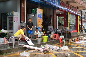 (250620) -- LONGSHAN, 20 junio, 2025 (Xinhua) -- Propietarios de tiendas limpian sus negocios tras las fuertes lluvias, en el distrito de Longshan, en la provincia de Hunan, en el centro de China, el 20 de junio de 2025. Las lluvias torrenciales han causado graves inundaciones urbanas en el distrito de Longshan, en la provincia central china de Hunan. (Xinhua/Chen Zhenhai) (oa) (ra) (ce)