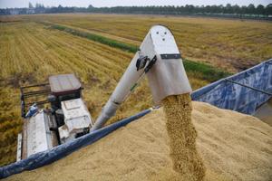 (251031) — CHANGSHA, 31 octubre, 2025 (Xinhua) — Imagen del 29 de octubre de 2025 de arroz cosechado siendo cargado a un camión en los campos, en la aldea de Wangjiahu, en el distrito de Datonghu de la ciudad de Yiyang, en la provincia de Hunan, en el centro de China. Más de 2.000 mu (cerca de 133,33 hectáreas) de arrozales tardíos operados por una cooperativa profesional en el distrito de Datonghu de la ciudad de Yiyang han entrado en la temporada de cosecha. (Xinhua/Chen Zhenhai) (rtg) (ra) (ce)