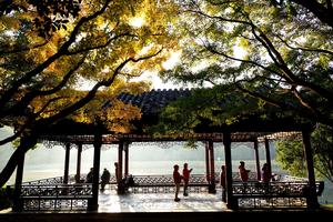 (251121) -- BEIJING, 21 noviembre, 2025 (Xinhua) -- Turistas realizan ejercicio matutino en un pabellón en el área escénica del Lago Oeste, en Hangzhou, en la provincia de Zhejiang, en el este de China, 21 de noviembre de 2025. (Xinhua/Zhuang Yingchang) (oa) (ra) (ce)