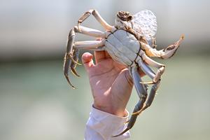 (250926) — SUZHOU, 26 septiembre, 2025 (Xinhua) — Un criador de cangrejos muestra un cangrejo recién capturado del lago Yangcheng, en Suzhou, en la provincia de Jiangsu, en el este de China, el 26 de septiembre de 2025. La temporada de recolección de este año de los codiciados cangrejos de agua dulce de China comenzó el viernes en el lago Yangcheng. (Xinhua/Wang Xuzhong) (oa) (ra) (ce)