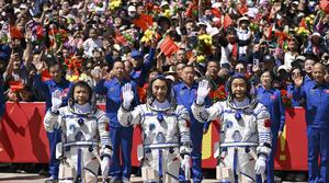 (250424) -- JIUQUAN, 24 abril, 2025 (Xinhua) -- Los astronautas chinos Chen Dong (d), Chen Zhongrui (c) y Wang Jie, asisten a una ceremonia de despedida en el Centro de Lanzamiento de Satélites de Jiuquan, en el noroeste de China, el 24 de abril de 2025. Una ceremonia de despedida para los tres astronautas de la misión espacial tripulada Shenzhou-20 se llevó a cabo el jueves en el Centro de Lanzamiento de Satélites de Jiuquan, en el noroeste de China, informó la Agencia de Vuelos Espaciales Tripulados de China. (Xinhua/Lian Zhen) (rtg) (ra) (vf)