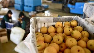 (251021) — ANSHAN, 21 octubre, 2025 (Xinhua) — Trabajadores clasifican peras Nanguo en una fábrica de vino de pera Nanguo, en la ciudad de Haicheng de Anshan, en la provincia de Liaoning, en el noreste de China, el 21 de octubre de 2025. Recientemente, las empresas procesadoras de pera Nanguo en la ciudad de Haicheng han entrado en su temporada alta de producción, transformando las peras en productos de alto valor añadido, como vino de pera y pasta de pera. (Xinhua/Wu Qinghao) (jg) (ra) (ce)