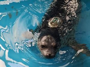 (260416) -- DALIAN, 16 abril, 2026 (Xinhua) -- Imagen del 15 de abril de 2026 de una foca manchada, con una etiqueta de seguimiento y localización en el lomo, nadando en una piscina antes de ser liberada en el Instituto de Investigación de Ciencias Oceánicas y Pesqueras de Liaoning, en Dalian, en la provincia de Liaoning, en el noreste de China. Cinco focas manchadas fueron liberadas el jueves en aguas frente a la costa de Dalian. Tres de ellas fueron rescatadas y rehabilitadas por el Instituto de Investigación de Ciencias Oceánicas y Pesqueras de Liaoning, mientras que las otras dos fueron criadas artificialmente por Sunasia Ocean World en Dalian. (Xinhua/Han He) (jg) (ah) (ce)