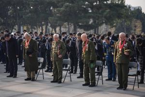 (251025) — SHENYANG, 25 octubre, 2025 (Xinhua) — Veteranos de los Voluntarios del Pueblo Chino (VPCh) guardan un momento de silencio durante una ceremonia de presentación de cestas de flores en el cementerio de los mártires de los VPCh, en Shenyang, en la provincia de Liaoning, en el noreste de China, el 25 de octubre de 2025. La provincia de Liaoning realizó el sábado ceremonias de presentación de cestas de flores en Shenyang y Dandong para conmemorar el 75º aniversario del ingreso a la República Popular Democrática de Corea de los VPCh para luchar en la Guerra de Resistencia contra la Agresión de Estados Unidos y de Ayuda a Corea. (Xinhua/Pan Yulong) (jg) (da)
