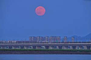 (251007) — WENZHOU, 7 octubre, 2025 (Xinhua) — La luna llena es vista sobre un tren en marcha, en la ciudad de Wenzhou, en la provincia de Zhejiang, en el este de China, el 7 de octubre de 2025. (Xinhua/Su Qiaojiang) (oa) (ah) (ce)