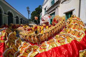 (250129) -- MACAO, 29 enero, 2025 (Xinhua) -- Personas realizan la danza del dragón durante un evento turístico en celebración del Año Nuevo chino en la Plaza de San Agustín, en Macao, en el sur de China, el 29 de enero de 2025. (Xinhua/Cheong Kam Ka) (ah) (ra) (ce)