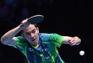 (250419) -- MACAO, 19 abril, 2025 (Xinhua) -- Hugo Calderano devuelve la pelota durante la semifinal de individuales masculinos entre Wang Chuqin, de China, y Hugo Calderano, de Brasil, en la Copa del Mundo Masculina y Femenina de la ITTF 2025, en Macao, China, el 19 de abril de 2025. (Xinhua/Chen Duo) (oa) (da)
