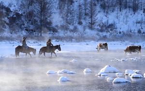 (260101) -- ARXAN, 1 enero, 2026 (Xinhua) -- Turistas montan caballos a través del río Halha, en la ciudad de Arxan de la Liga de Hinggan, en la región autónoma de Mongolia Interior, en el norte de China, el 1 de enero de 2026. A pesar del gélido frío invernal de Arxan, esta sección del río Halha, afectada por la geotermia, nunca se congela, lo que atrae a una gran cantidad de turistas en invierno. (Xinhua/Wang Zheng) (da) (ra) (vf)