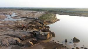 (250818) -- BAYANNUR, 18 agosto, 2025 (Xinhua) -- Vista aérea tomada con un dron el 17 de agosto de 2025 de rescatistas buscando personas desaparecidas, en la bandera de Urad Rear, en la ciudad de Bayannur, en la región autónoma de Mongolia Interior, en el norte de China. La cifra de muertos subió a 10 y dos personas siguen desaparecidas a causa de una inundación repentina que arrasó un campamento al aire libre en la región autónoma de Mongolia Interior, en el norte de China, informaron el domingo las autoridades locales de emergencia. (Xinhua/Ma Jinrui) (rtg) (ah) (vf)