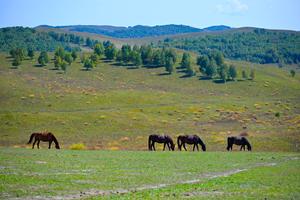 (250913) — CHIFENG, 13 septiembre, 2025 (Xinhua) — Imagen del 12 de septiembre de 2025 de caballos pastando en la pradera de Ulan Butong, en la bandera de Hexigten de Chifeng, en la región autónoma de Mongolia Interior, en el norte de China. (Xinhua/Peng Yuan) (oa) (da)