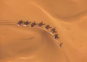 (250802) -- ERDOS, 2 agosto, 2025 (Xinhua) -- Vista aérea tomada con un dron el 1 de agosto de 2025 de personas montando camellos en un área escénica desértica, en la bandera de Dalad de la ciudad de Erdos, en la región autónoma de Mongolia Interior, en el norte de China. El desierto de Kubuqi, en la ciudad de Erdos, ha entrado en su temporada alta de turismo en pleno verano, atrayendo a numerosos turistas de todo el país para visitar. (Xinhua/Lian Zhen) (oa) (da)