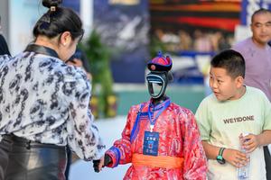 (250829) -- HOHHOT, 29 agosto, 2025 (Xinhua) -- Una visitante estrecha la mano de un robot en la 5 Exposición China-Mongolia, en Hohhot, en la región autónoma de Mongolia Interior, en el norte de China, el 29 de agosto de 2025. La 5 Exposición China-Mongolia en curso, que comenzó el 25 de agosto, ha atraído a más de 1.500 expositores nacionales y extranjeros. (Xinhua/Lian Zhen) (oa) (ra) (vf)