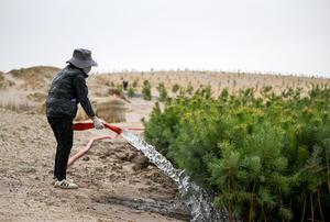 (260420) -- TONGLIAO, 20 abril, 2026 (Xinhua) -- Imagen del 19 de abril de 2026 de un trabajador regando árboles en una área de un proyecto contra la desertificación, en la bandera trasera del ala izquierda de Horqin de la ciudad de Tongliao, en la región autónoma de Mongolia Interior, en el norte de China. El área arenosa de este proyecto abarca casi 3.000 mu (200 hectáreas), lo que la convierte en la última zona de terreno arenoso móvil y semimóvil que se va a tratar en la bandera trasera del ala izquierda de Horqin. (Xinhua/Lian Zhen) (oa) (ah) (vf)