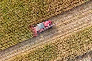 (251015) — BAYANNUR, 15 octubre, 2025 (Xinhua) — Vista aérea tomada con un dron de una segadora cosechando maíz, en la bandera frontal de Urad, en Bayannur, en la región autónoma de Mongolia Interior, en el norte de China, el 15 de octubre de 2025. La bandera frontal de Urad en Bayannur ha entrado recientemente en la temporada de cosecha de otoño, con la agricultura mecanizada aplicada para mejorar la eficiencia. (Xinhua/Ma Jinrui) (jg) (da) (vf)