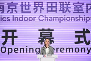 (250321) -- NANJING, 21 marzo, 2025 (Xinhua) -- Ximena Restrepo, vicepresidenta de World Athletics, habla durante la ceremonia de apertura del Campeonato Mundial de Atletismo en Pista Cubierta 2025, en Nanjing, en la provincia de Jiangsu, en el este de China, el 21 de marzo de 2025. (Xinhua/Song Yanhua) (rtg) (ra) (vf)