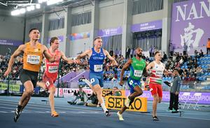 (250322) -- NANJING, 22 marzo, 2025 (Xinhua) -- (De izq. a der.) Till Steinforth, de Alemania, Sander Skotheim, de Noruega, Johannes Erm, de Estonia, Pedro de Oliveira, de Brasil, y Zsombor Galpal, de Hungría, compiten durante los 60 metros de heptatlón masculino en el Campeonato Mundial de Atletismo en Pista Cubierta 2025, en Nanjing, en la provincia de Jiangsu, en el este de China, el 22 de marzo de 2025. (Xinhua/Song Yanhua) (oa) (da)