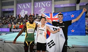 (250321) — NANJING, 21 marzo, 2025 (Xinhua) — (De izq. a der.) Raymond Richards, de Jamaica, Woo Sanghyeok, de República de Corea, y Hamish Kerr, de Nueva Zelanda, festejan al término de la final de salto de altura masculino en el Campeonato Mundial de Atletismo en Pista Cubierta 2025, en Nanjing, en la provincia de Jiangsu, en el este de China, el 21 de marzo de 2025. (Xinhua/Song Yanhua) (oa) (ra) (ce)