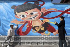 (250302) -- BEIJING, 2 marzo, 2025 (Xinhua) -- Imagen del 1 de marzo de 2025 de una niña posando para fotografías con una pintura mural de la exitosa película animada "Ne Zha 2", en la aldea Dongfeng del distrito de Boxing, en Binzhou, en la provincia de Shandong, en el este de China. (Xinhua/Chen Bin) (oa) (da)