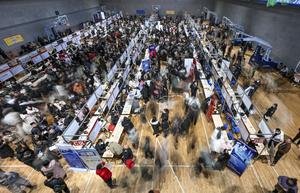 (250215) — YINCHUAN, 15 febrero, 2025 (Xinhua) — Solicitantes de trabajo asisten a una feria de empleo celebrada en Yinchuan, en la región autónoma hui de Ningxia, en el noroeste de China, el 15 de febrero de 2025. La feria de empleo comenzó aquí el sábado. Más de 200 empresas de diversas industrias, como las nuevas energías, la biotecnología y el comercio electrónico, ofrecen más de 4.000 vacantes a los solicitantes de trabajo. (Xinhua/Feng Kaihua) (oa) (da)