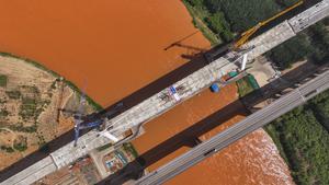 (250703) -- ZHONGWEI, 3 julio, 2025 (Xinhua) -- Vista aérea tomada con un dron el 3 de julio de 2025 del gran puente de la Garganta de Heishan sobre el Río Amarillo, en la ciudad de Zhongwei, en la región autónoma de la etnia hui de Ningxia, en el noroeste de China. Los dos lados del gran puente de la Garganta de Heishan sobre el Río Amarillo fueron unidos el jueves, sentando una base sólida para su finalización este año. (Xinhua/Feng Kaihua) (jg) (ah) (vf)