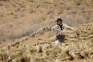 (260411) -- ZHONGWEI, 11 abril, 2026 (Xinhua) -- Imagen del 10 de abril de 2026 de un trabajador colocando barreras de paja en forma de tablero de ajedrez sobre la arena en el desierto de Tengger, en la región autónoma hui de Ningxia, en el noroeste de China. Los trabajadores de la ciudad de Zhongwei están mejorando las barreras en el desierto de Tengger mediante la colocación de nuevas barreras de paja en forma de tablero de ajedrez para mejorar la eficacia del control del desierto. (Xinhua/Wang Peng) (rtg) (da)