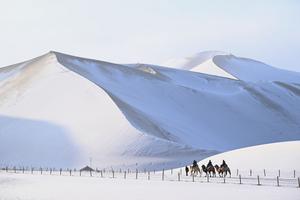 (251216) -- BEIJING, 16 diciembre, 2025 (Xinhua) -- Imagen del 12 de diciembre de 2025 de turistas montando camellos para disfrutar del paisaje nevado en el Area Escénica de la Montaña Mingsha y el Manantial de la Luna Creciente, en la ciudad de Dunhuang, en la provincia de Gansu, en el noroeste de China. (Xinhua/Zhang Xiaoliang) (jg) (ra) (vf)