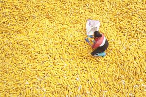 (251011) — BEIJING, 11 octubre, 2025 (Xinhua) — Vista aérea tomada con un dron el 11 de octubre de 2025 de una agricultora acomodando maíz recién cosechado, en la aldea de Lugezhuang, en la ciudad de Tangshan, en la provincia de Hebei, en el norte de China. (Xinhua/Zhu Dayong) (oa) (da)
