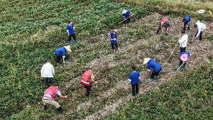 (251015) -- BEIJING, 15 octubre, 2025 (Xinhua) -- Vista aérea tomada con un dron de aldeanos cosechando batatas, en la aldea de Gaoxiu del poblado de Linxi, en el distrito autónomo dong de Sanjiang, en la región autónoma zhuang de Guangxi, en el sur de China, el 15 de octubre de 2025. (Xinhua/Zhang Ailin) (jg) (da) (ce)