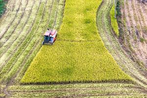 (251015) -- BEIJING, 15 octubre, 2025 (Xinhua) -- Vista aérea tomada con un dron de una cosechadora trabajando en un campo, en el distrito de Shuangfeng de la ciudad de Loudi, en la provincia de Hunan, en el centro de China, el 15 de octubre de 2025. (Xinhua/ Li Jianxin) (jg) (da) (ce)