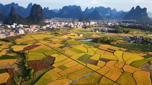 (251025) -- BEIJING, 25 octubre, 2025 (Xinhua) -- Vista aérea tomada con un dron el 24 de octubre de 2025 de los campos de arroz, en el poblado de Huangyao del distrito de Zhaoping, en la ciudad de Hezhou, en la región autónoma zhuang de Guangxi, en el sur de China. (Xinhua/Huang Xuhu) (oa) (da)