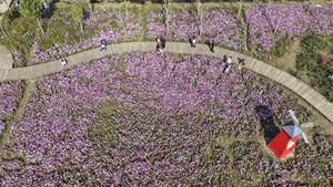 (251105) -- BEIJING, 5 noviembre, 2025 (Xinhua) -- Vista aérea tomada con un dron el 5 de noviembre de 2025 de personas admirando la floración en un área escénica, en el distrito de Guangrao de la ciudad de Dongying, en la provincia de Shandong, en el este de China. (Xinhua/Liu Yunjie) (ah) (ra) (ce)