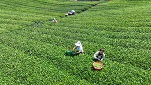 (251011) -- BEIJING, 11 octubre, 2025 (Xinhua) -- Vista aérea tomada con un dron el 10 de octubre de 2025 de turistas experimentando la recolección de hojas de té en un jardín de té, en el poblado de Moganshan de Huzhou, en la provincia de Zhejiang, en el este de China. (Xinhua/Xie Shangguo) (oa) (da)